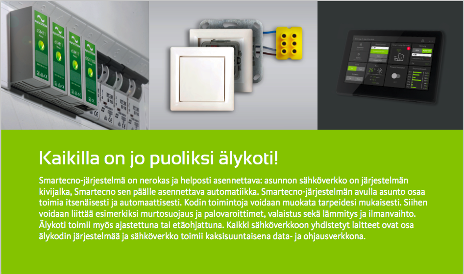 ![]() | Smartecno järjestelmä OSAA ENEMMÄNKYTKENTÄMODUULIT Hämmästyttävää, mitä kaikkea tämä huomaamaton elektroninen komponentti voi tehdä. Tämä High-tech-tuote muuntaa yksittäiset sähkölaitteet auttajien ryhmäksi, jotka tekevät elämästäsi mahdollisimman mukavaa. Kirkkaat värit selkeyttävät asennusta ja korostavat Smartecno järjestelmän käytettävyyttä. Kaikki pyörii alusta alkaen asukkaiden tarpeiden ehdoilla. TOIMINNOT - KYTKIN Smartecno järjestelmällä voidaan yhdistää erilaisia sähkölaitetyyppejä yhteen tilanteeseen: TV päälle, kaihtimet alas, valaistuksen himmennys. MITTAUS Smartecno järjestelmällä voidaan himmentää ja yhdistää lähes kaikenlaisia valaisimia. Ne voivat luoda loistavia valaistustilanteita vain yhdellä painalluksella. ENNALTA-AJATELTU Smartecno järjestelmässä sinulla on käytetävissäsi monia uusia sovelluksia, koska jokainen komponentti on itsessään älykäs. Kytkentämoduuli tunnistaa virrankulutuksen muuttuneen ja voi siksi ilmoittaa, että vedenkeitin on nyt valmis tai himmentää valaistuksen kun TV alkaa kuluttaa energiaa päälle kytkettäessä. KÄYTÖSSÄ Smartecno järjestelmä on yksinkertainen, älykäs automaatioverkko kodin sähköjärjestelmään. Tämä mahdollistaa täysin uusia toimintoja valaistuksen, turvallisuuden ja energian hallintaan. Valaisimet voidaan kytkeä tai himmentää erilaisiin valaistustilanteisiin joko erikseen tai yhdessä. Riippumatta kytkimen tai lampun tyypistä. Kuunteletko musiikkia kuulokkeilla? Imuroitko tai kuivaatko hiuksiasi? Ovikelloa soittava vieras ei enää jää huomaamatta, koska järjestelmä sammuttaa imurin hetkeksi ja vilkuttaa valoja, kun ovikello soi. Voit myös vain yhtä kytkintä painamalla sammuttaa poistuessasi talon kaikki laitteet, joita ei tarvita poissa ollessasi. Koko järjestelmän toiminta perustuu olemassa olevaan kotisi 230V sähköverkkoon - lisäasennuksia ei tarvita. Kotisi on jo puoliksi älykoti - Smartecno järjestelmällä täydennät sen. |