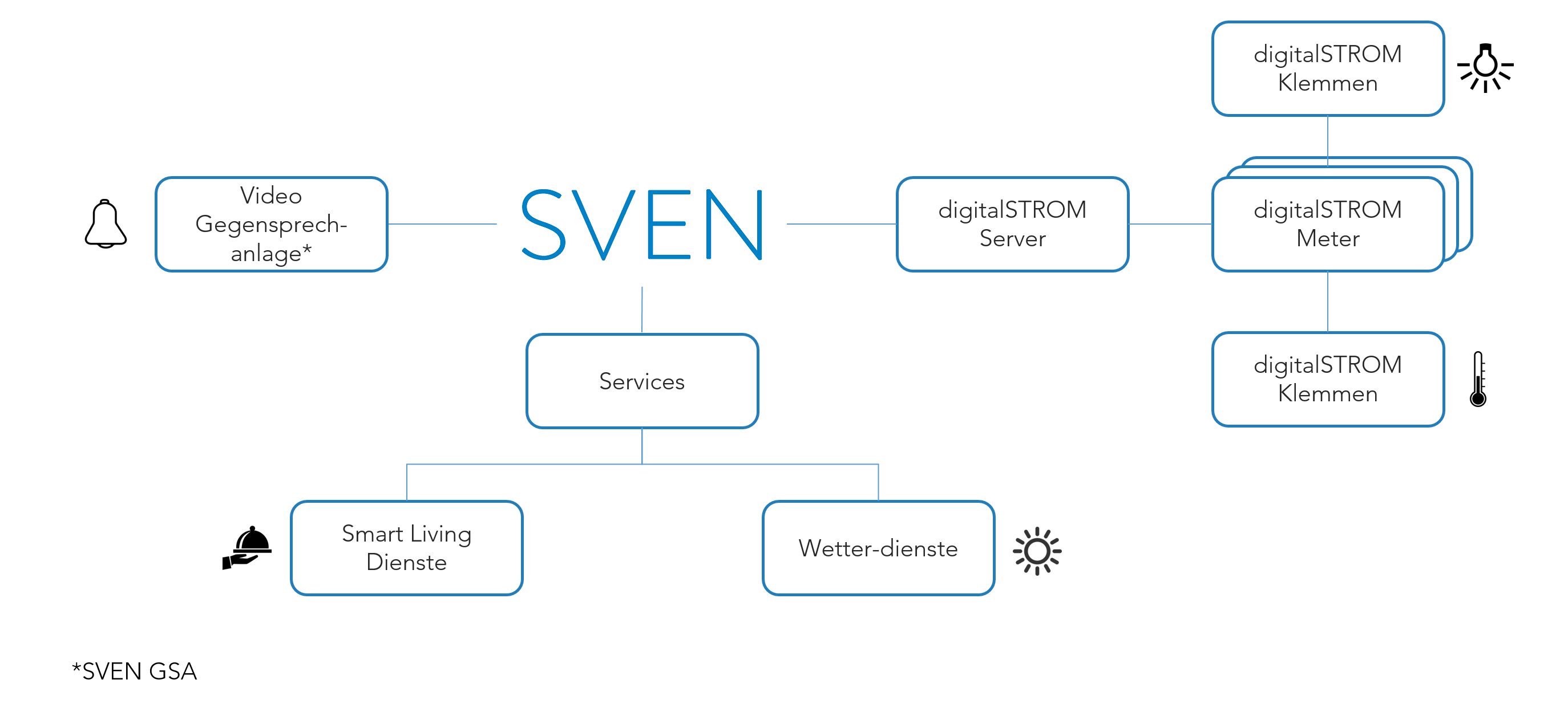JärjestelmäSVEN on visualisointi ja ohjaus digitalSTROM arkkitehtuurille. digitalSTROM ”dS Ready” sertifiointi vahvistaa tämän. SVEN lukee kaikki tiedot dS palvelimelta ja esittää ne intuitiivisessa valikossa käyttäjälle. Virtalähde sekä verkkoyhteys taataan yhdellä PoE (Power over Ethernet) liitännällä. Älykkäät asumispalvelutÄlykkäät asumispalvelut tarjoavat erittäin laajan valikoiman lisäarvo- sovelluksia vuokralaisille sekä asunnonvuokrauksen hallintaan. Vuokralaiselle, älykkäät asumispalvelut tarkoittavat huomattavaa helpotusta jokapäiväiseen elämään. Nyt voit varata kellarissa tai yhteisissä tiloissa olevan pesukoneen mukavasti SVEN:llä ja jopa tilata pizzan illalliseksi. Vuokranantajalle älykkäät asumispalvelut tarjoavat mahdollisuuden helppoon viestintään vuokralaisen kanssa. Eri hovimestari-, verkko- ja älykkäiden asumispalveluiden tarjoaman myötä avautuu vuokranantajille myös lisää ansaintamahdollisuuksia. |